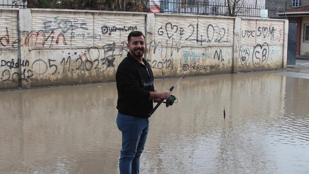 Adana'da yağmur sonrası göle dönen bir sokakta esnaflık yapan genç altyapı sorununa dikkat çekmek için su birikintisine olta attı.