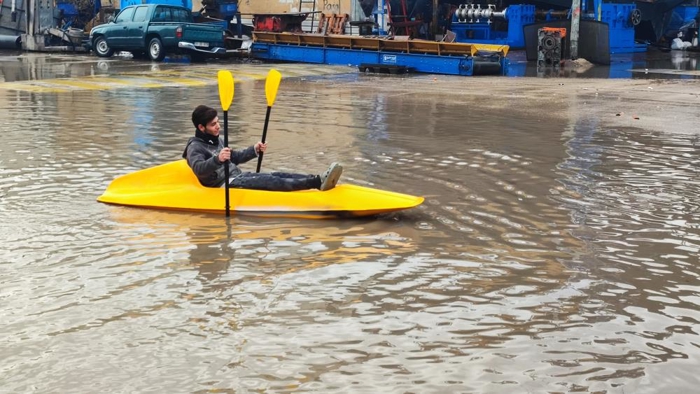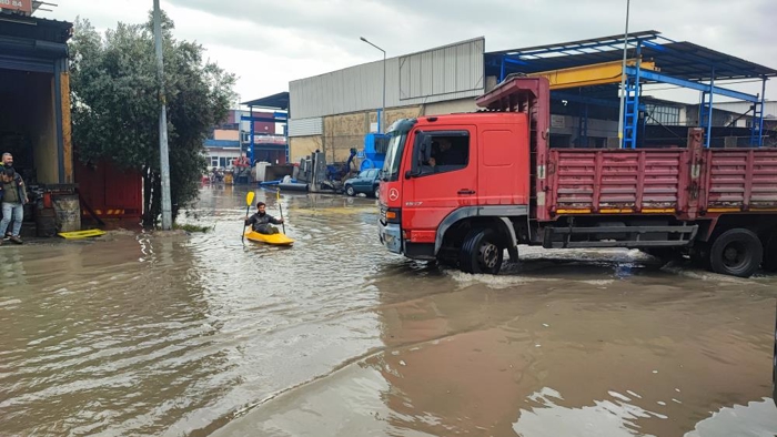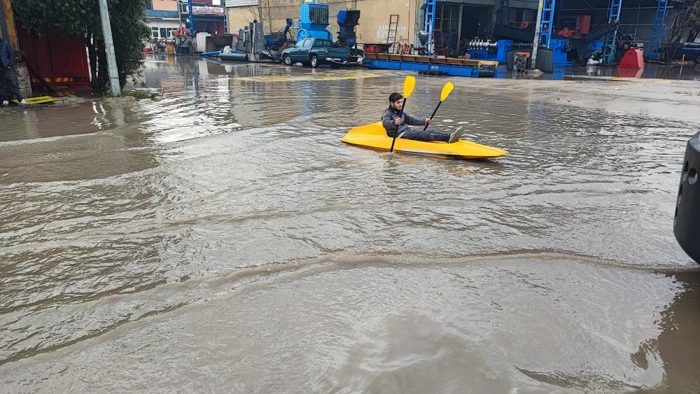 Fiber glas imalathanesinde çalışan Baran Dudukanlı, her yağmurda aynı manzarayla karşılaştıklarını belirterek, imalathanede ürettikleri kanoyla sokağa açıldı. Dudukanlı, bu sırada yoldan geçen araçlarla karşı karşıya geldi. Araçların kanoya yol vermesi ilginç bir görüntü oluşturdu.