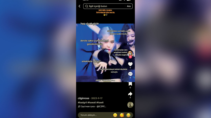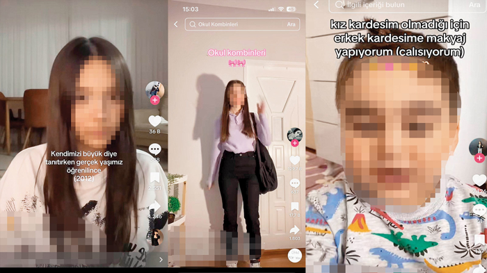 '10 yaş için makyaj' ve '15 yaş okul kombinleri' gibi başlıklı videolarda ağır filtreler, yetişkin makyaj teknikleri yer alıyor. 'Bad girl taktikleri' başlıklı videolarda; okulda zorbalık, dersi sabote etmek, siyah giyinip korkutucu görünmek 'havalı' olarak sunuluyor. Zorbalık mizah ve trend kisvesiyle normalleştiriliyor. 'Fenomen öğrenciler' ise sınıf içi görüntüleri, teneffüsleri ve ders anlarını vlog olarak paylaşıp arkadaşlarının mahremiyetini ve güvenliğini riske atıyor.