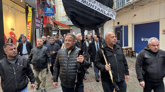 Yaklaşık 50 muhtar, "Aydın'da yatırımı engelleyen CHP'yi protesto ediyoruz. Aydınlı muhtarlar" yazılı siyah çelenkle CHP İl Başkanlığı önüne geldi.