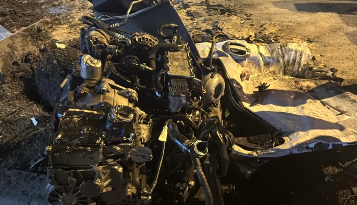 Çarpmanın şiddetiyle büyük hasar alan araçlardan birinin motoru koparak yola savruldu.