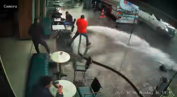 İstanbul Bayrampaşa'da bir kafe işletmecisi, iş yerinin önünü tazyikli su ile yıkamaya çalıştığı esnada hortumun kontrolünü kaybetti. Şov yapayım derken tazyikli suyun azizliğine uğrayan esnaf, kafe önünde çay içen müşterilerini ıslattı.