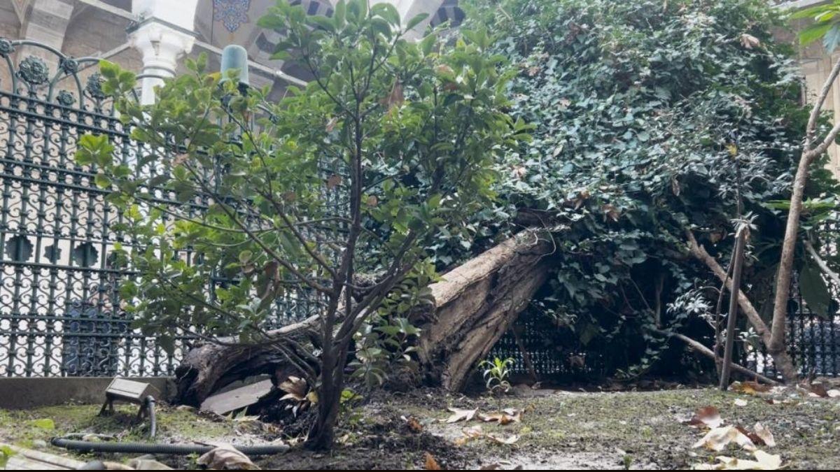 Eyüp Sultan Camii avlusunda ağaç, demir korkulukların üzerine devrildi.