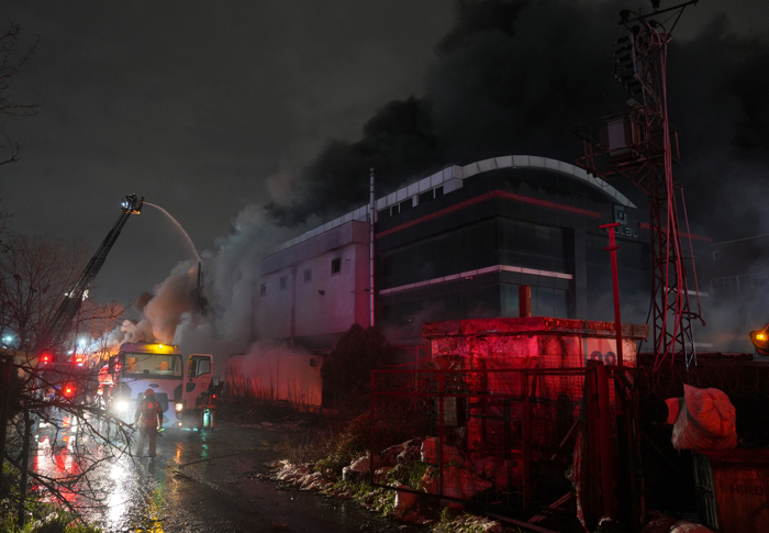 Esenyurt'ta inşaat malzemeleri üreten fabrikada çıkan yangına itfaiye ekipleri müdahale ediyor.