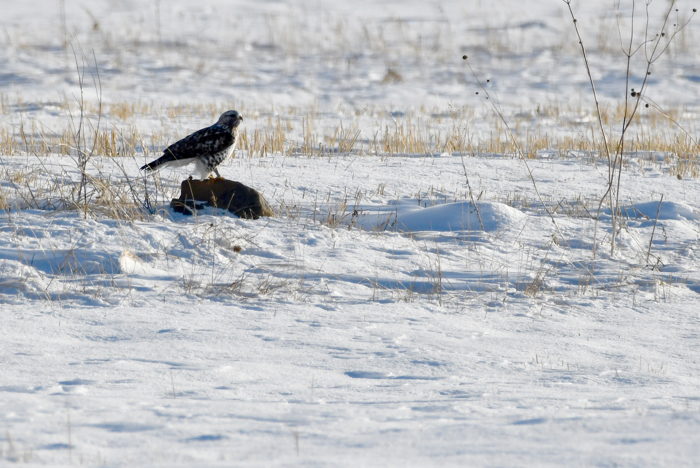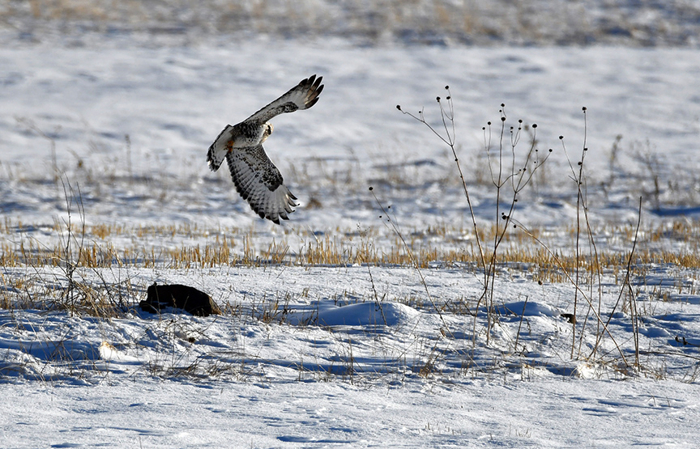 Kars'ın Sarıkamış ilçesinde kızıl tilki ile kış aylarında nadir görülen paçalı şahin görüntülendi.
