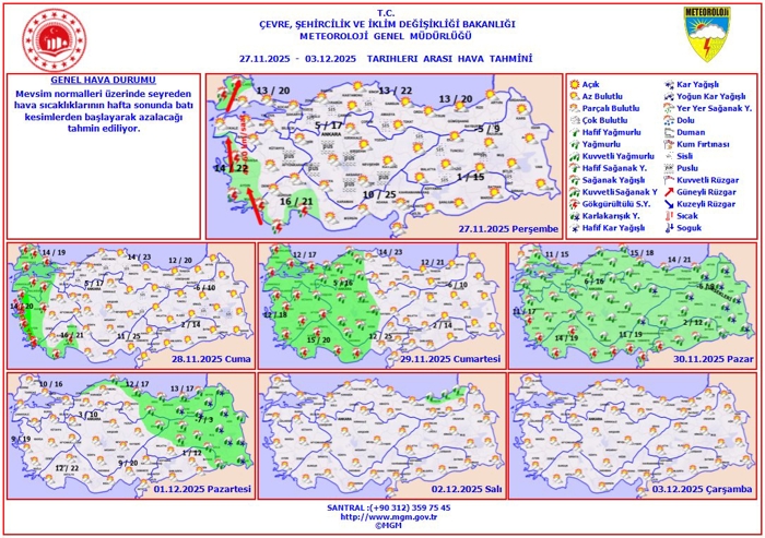Meteoroloji Genel Müdürlüğü (MGM), hava tahmin raporuna göre, yurdun genelinde mevsim normalleri üzerinde seyreden hava sıcaklıklarının, hafta sonundan itibaren batı kesimlerden başlayarak azalacağı tahmin ediliyor.