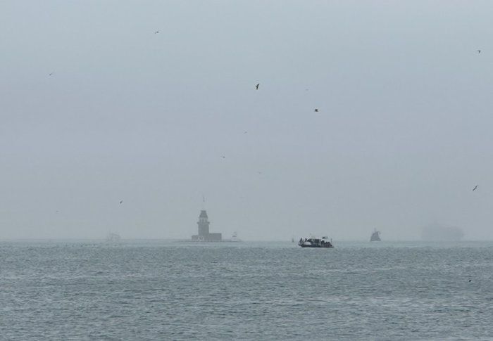 Yüksek katlı binaların üst katları sis nedeniyle görünmez hale gelirken, Boğaz hattındaki tarihi yapılar da sis altında kaldı.
