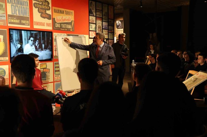 Demokrasi ve milli egemenlik tarihi bakımından Nisan ayını önemsediklerini ve bu nedenle bu ayı 'Milli Egemenlik ve Demokrasi Ayı' ilan ettiklerini kaydeden Bakan Tekin, Demokrasi Müzesi'nde verdiği dersinde demokrasi şehidi Aydınlı Başvekil Adnan Menderes'in siyasi hayatı ve o dönemde yaşananlardan bazı kesitlere yer verdi. Adnan Menderes'in içinde siyasete başladığı CHP'nin takip ettiği politikayı, ülke çıkarları adına beğenmeyerek Celal Bayar ile Demokrat Parti'yi kurduğunu belirten Tekin, Türkiye'de birden fazla siyasi partinin katıldığı ilk seçimde açık oy kullanılıp gizli sayım yapılan günleri anlattı. 27 Mayıs 1960'da halkın iradesi yok sayılarak yapılan darbeden de kısaca söz eden Bakan Tekin, millet iradesi ve demokrasinin önemine değindi.