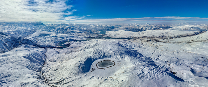 Karlı Munzur Dağları manzarası arasında saklı kalan göl, dronla görüntülendi.