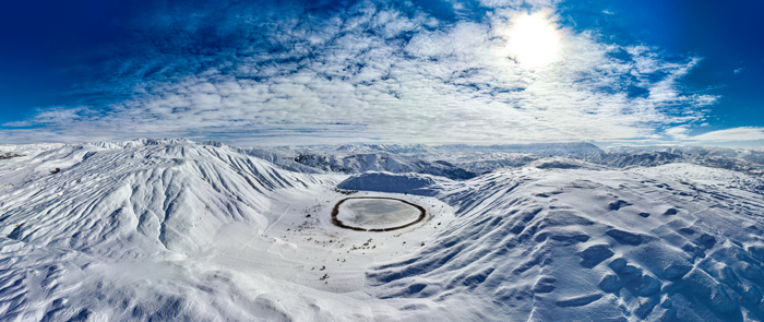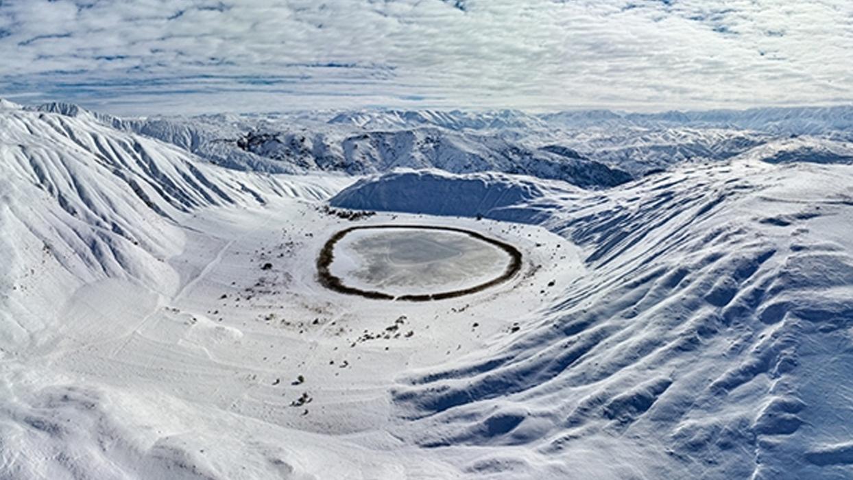 Erzincan'daki Boyalık ile Hasanova köyleri arasında yer alan, 350 metre çapında dairesel yapısıyla dikkati çeken göl, kar yağışı ve dondurucu soğukların etkisiyle buz tuttu.