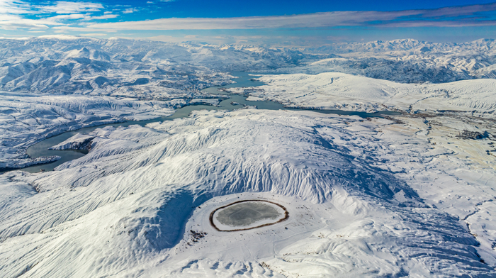 Munzur Dağları manzarası arasında saklı kalan ve beyaza bürünen göl böyle görüntülendi!