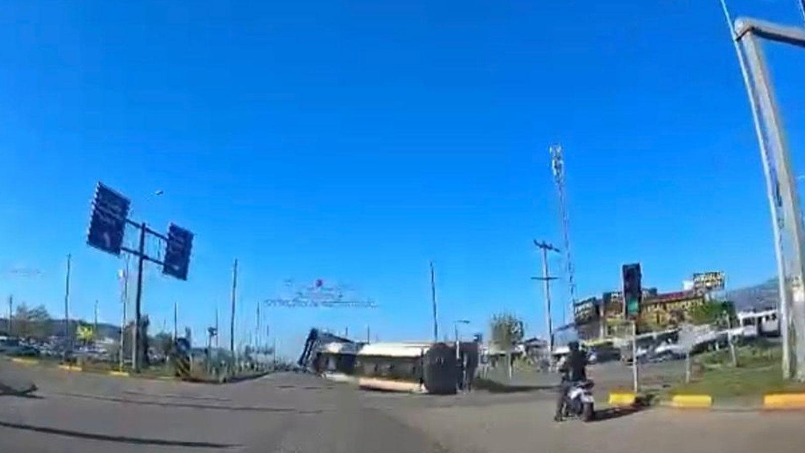 Kaza anı, kavşaktaki başka bir aracın güvenlik kamerasına yansıdı. Görüntülerde, kavşaktan dönmeye çalışan tırın bir anda kontrolden çıkarak devrilmesi ve ortalığı toz bulutu kaplaması yer aldı.
