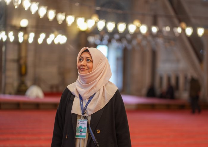 Yaklaşık 13 yıldır İstanbul'da yaşayan ve kendine yeni bir hayat kuran Amira, Süleymaniye Camisi'nde Kültürlerarası İletişim Merkezi (KİM) Vakfı gönüllüsü olarak İspanyolca bilen turistlere İslam'ı anlatıyor.