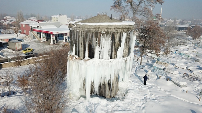 Fatih Mahallesi'ndeki mezarlıkta bulunan su deposunun etrafında metrelerce uzunlukta buz sarkıtları oluştu.