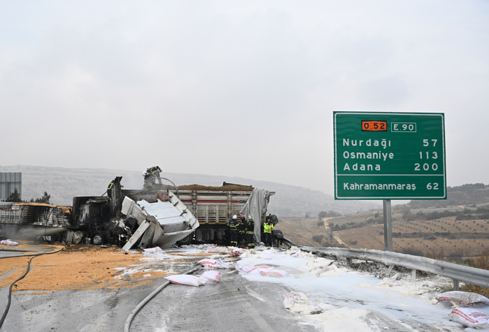 Gaziantep'te 3 tırın çarpıştığı zincirleme trafik kazasının ardından araçlarda çıkan yangın söndürüldü.