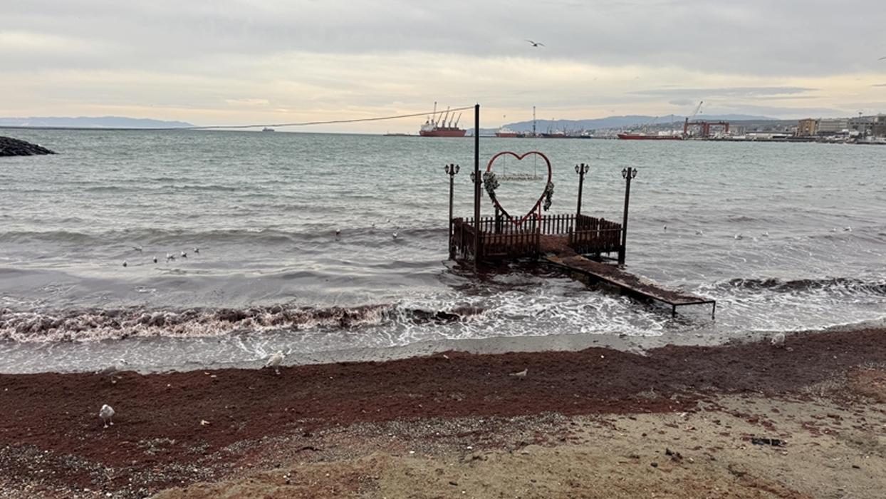 Tekirdağ'da kuvvetli rüzgar nedeniyle sahilin bir kısmı kırmızı yosunla kaplandı.