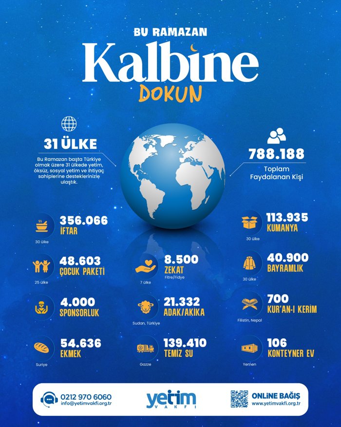 Yetim Vakfı, 2026 yılı Ramazan çalışmaları kapsamında başta Türkiye olmak üzere 31 ülkede gerçekleştirdiği yardım faaliyetleriyle toplam 788.628 kişiye ulaştı. Gazze, Yemen ve Suriye gibi kriz bölgelerine öncelik verilen çalışmalarda, yüz binlerce kişiye iftar, temiz su ve barınma desteği sağlanırken, "Savaş ve Çocuk" raporu ile yetimlerin yaşadığı zorluklara dikkat çekildi.