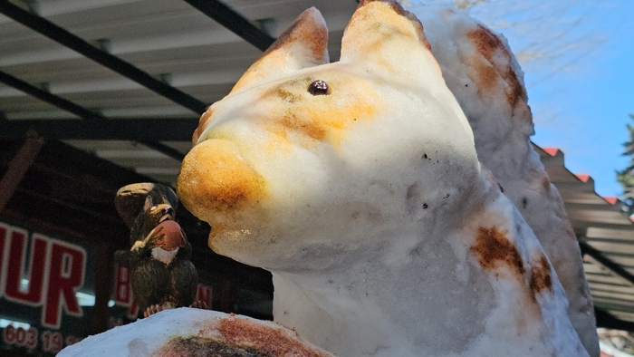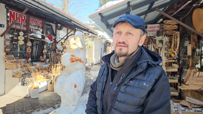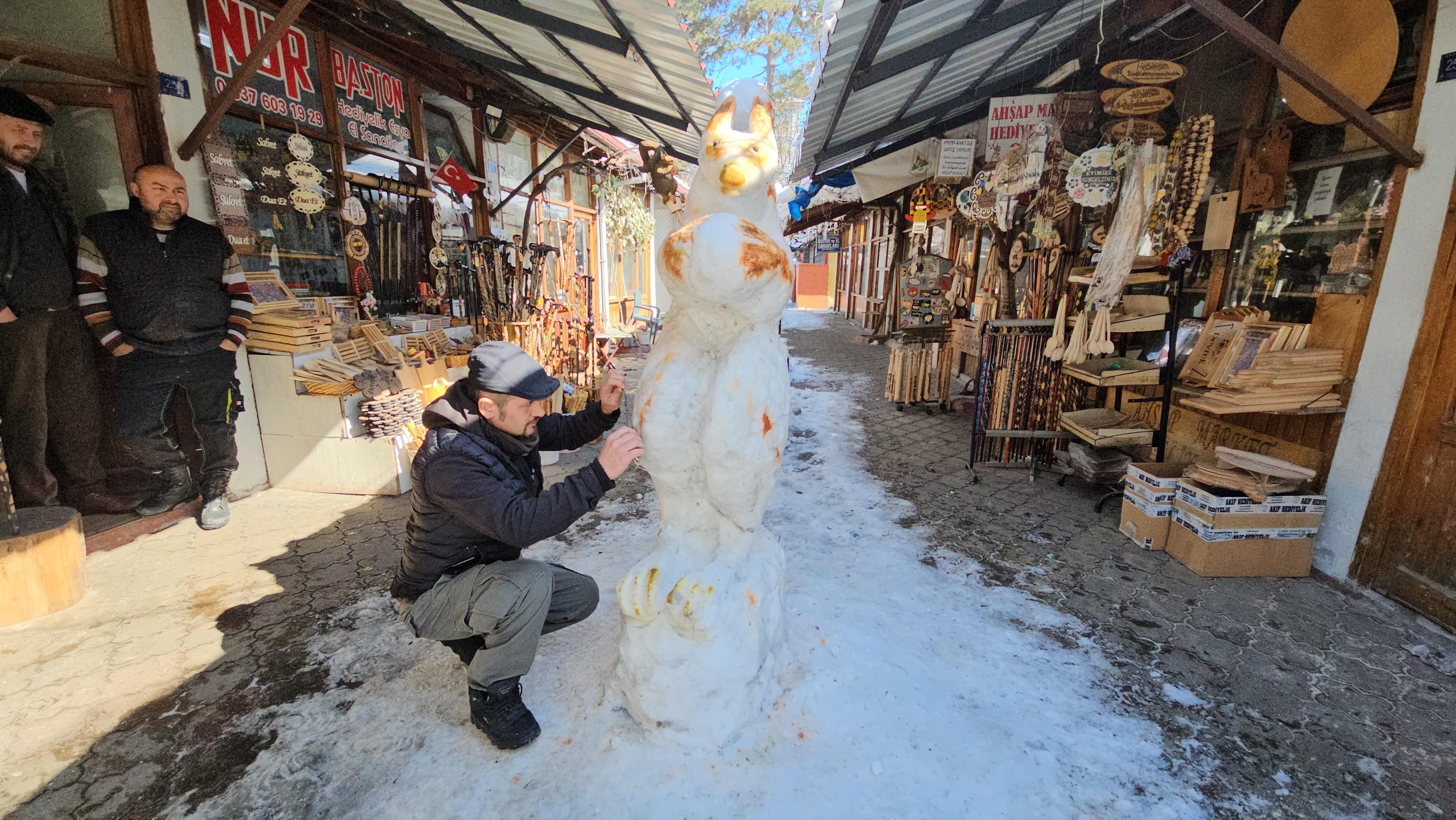 İlçede çocukluğundan bu yana baston ustalığıyla uğraşan Güllüoğlu, kardan yaptığı sincap figürüyle görenleri hayran bıraktı. Elindeki ceviz detayı, kuyruğu ve 180 santimetrelik boyu ile dikkatleri üzerine çeken kardan sincabı görenler fotoğraf çektirdi.