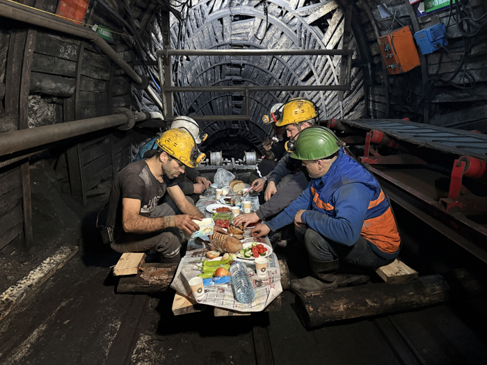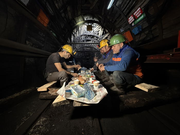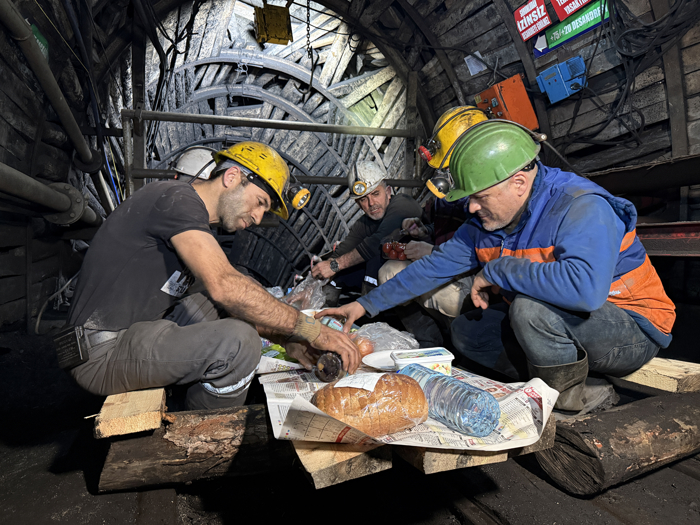 Baretlerinin ışığının aydınlattığı ocak içinde ilk sahurlarını yapmanın heyecanını yaşayan maden işçileri, yanlarında getirdikleri domates, salatalık, soğan, biber, peynir, zeytin, konserve ve ekmeği kömürden kararmış elleriyle yedi.